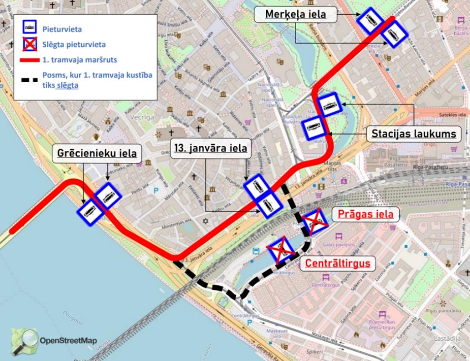Whereas, from the final point “Jugla”, trams route No.1 will run along the route to the stop “Stacijas laukums”, further along Radio Street, 13 January Street, 11 November Embankment and further along the route. In this direction, the stop “Central Market” (in Centrāltirgus Street) will be closed, on the by-pass route, trams will stop at the stop “13 January Street” (in 13 January Street).
