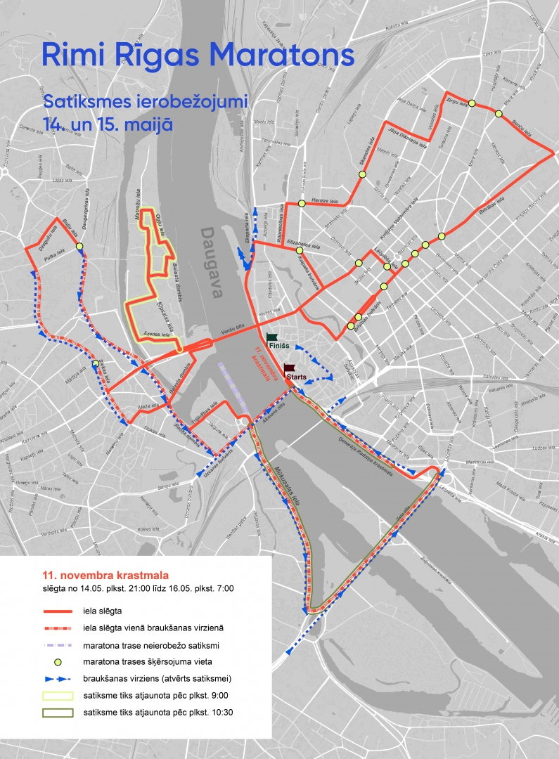From Saturday, May 14 at .21 .00 until Monday, May 16 pluck t. 7.00 will be closed by vehicle traffic 11. novembra krastmala, from the Stone Bridge to Muitas Street, and on the parallel street of 11. novembra krastmala on the side of Old Riga, from the Poļu gāte to Jaunielai. If needed, from 14 May plk t. 21.00 until 16 May .7 .00 Doma Square and Pils Street will organize two-way traffic.