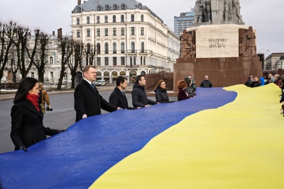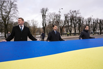 Turpinoties “Ukrainas nedēļai” galvaspilsētā, pie Brīvības pieminekļa ceturtdien, 17. februārī, notika pasākums “Karogs par mieru Ukrainā”, kura laikā svinīgi izklāja 30 metrus garu Ukrainas karogu.