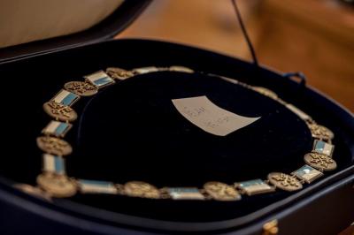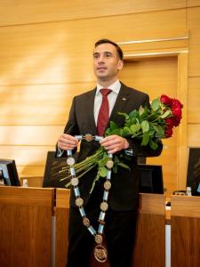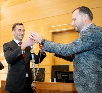 Jaunievēlētajam domes priekšsēdētājam pasniedz amata ķēdi