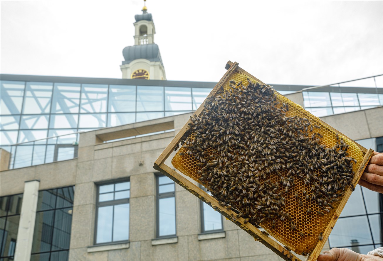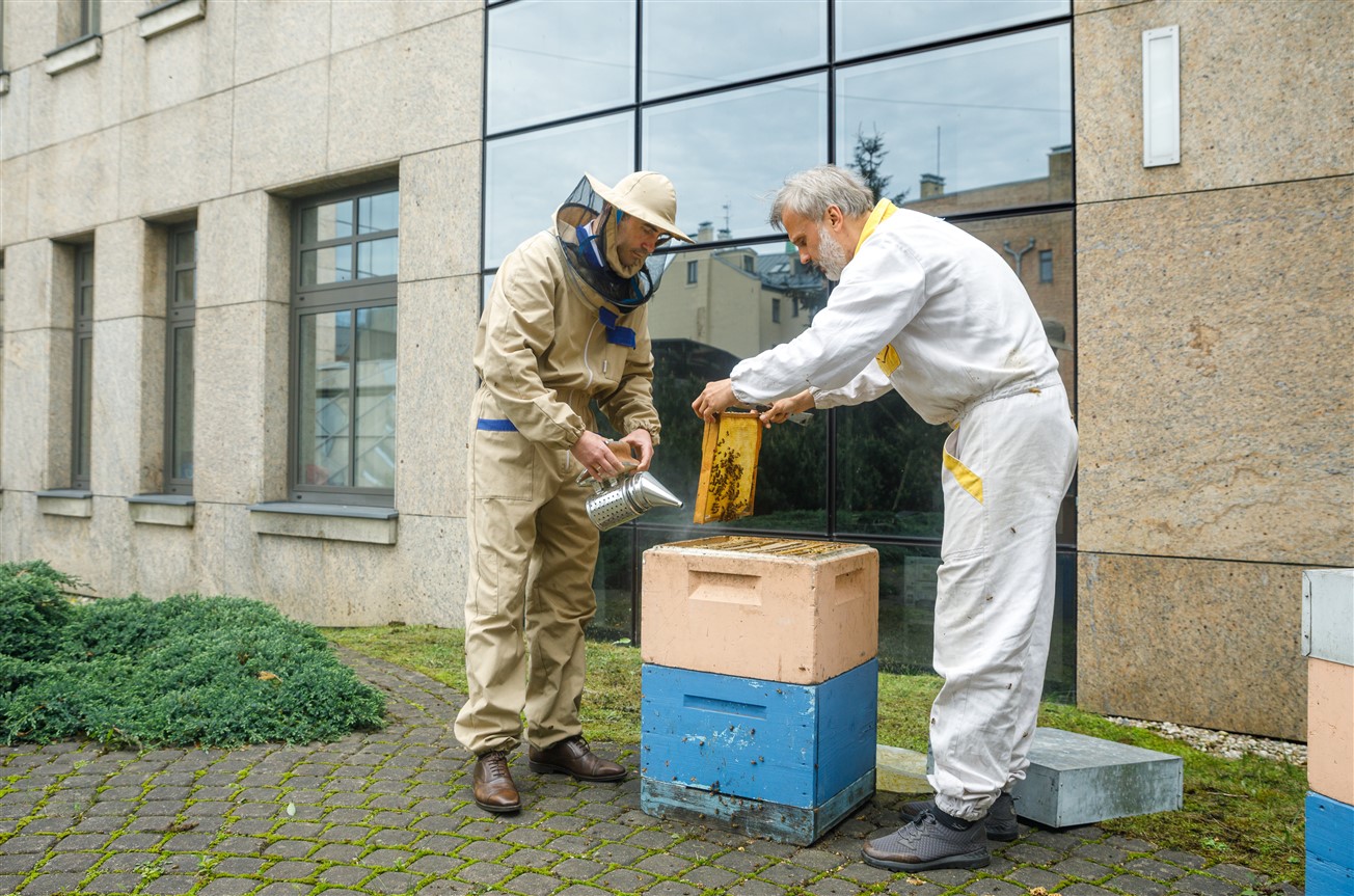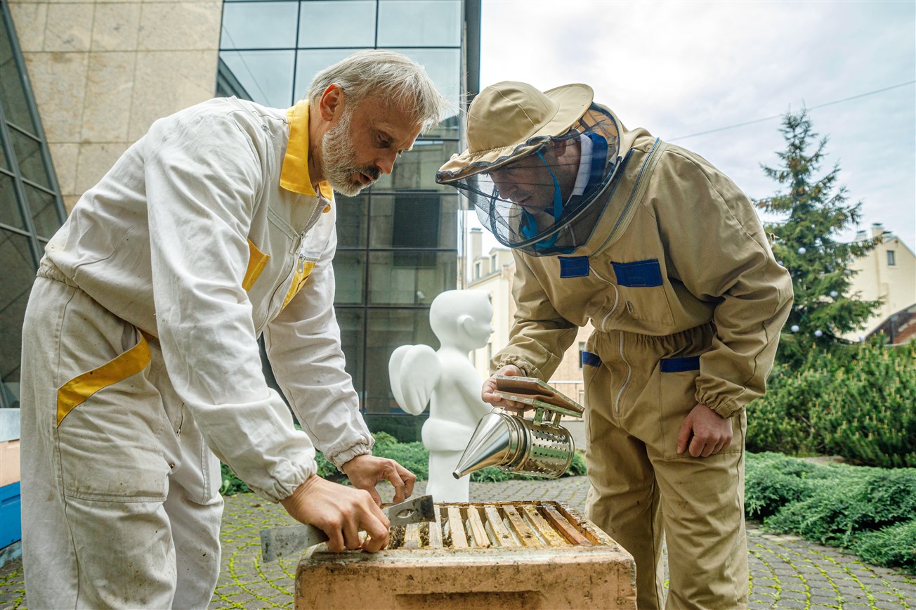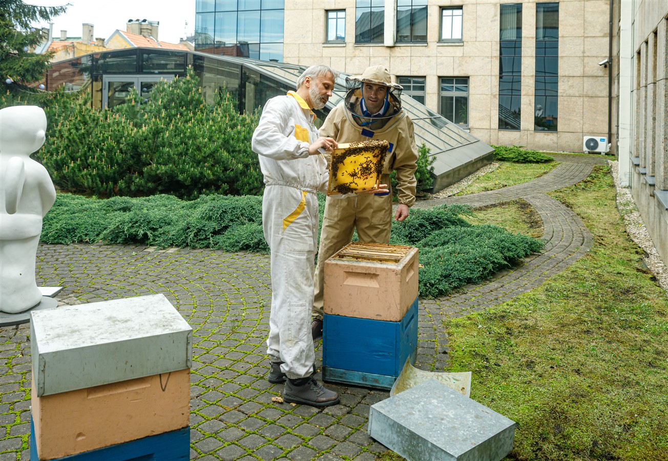 Rīgas domes priekšsēdētājs Mārtiņš Staķis kopā ar urbāno biškopi Uģi Mālnieku apkopj uz terases izvietotos trīs bišu stropus