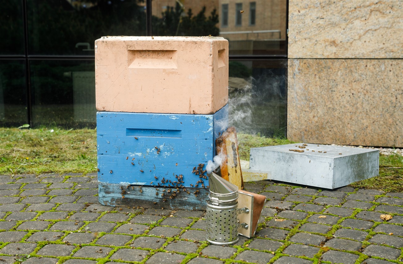 Urbāno biškopis Uģis Mālnieks apkopj uz terases izvietotos trīs bišu stropus