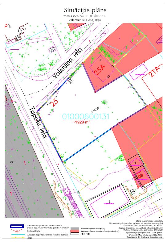 Neapbūvēts zemesgabals Valentīna ielā 25, Rīgā (kadastra apzīmējums 0100 060 0131) 1923 m² platībā (turpmāk – Zemesgabals). Zemesgabala izmantošanas mērķis: izmantošana atbilstoši Rīgas domes 20.12.2005. saistošajos noteikumos Nr. 34 “Rīgas teritorijas izmantošanas un apbūves noteikumi” ielu teritorijā atļautajai, t.sk. dažāda veida konteinera tipa būvju, bez piesaistes zemei, piekabju un ar būvniecību saistīto mehānismu un aprīkojuma (turpmāk – Objekts) īslaicīgai novietošanai un uzglabāšanai, kā arī uzturēšanai un apsaimniekošanai.. |