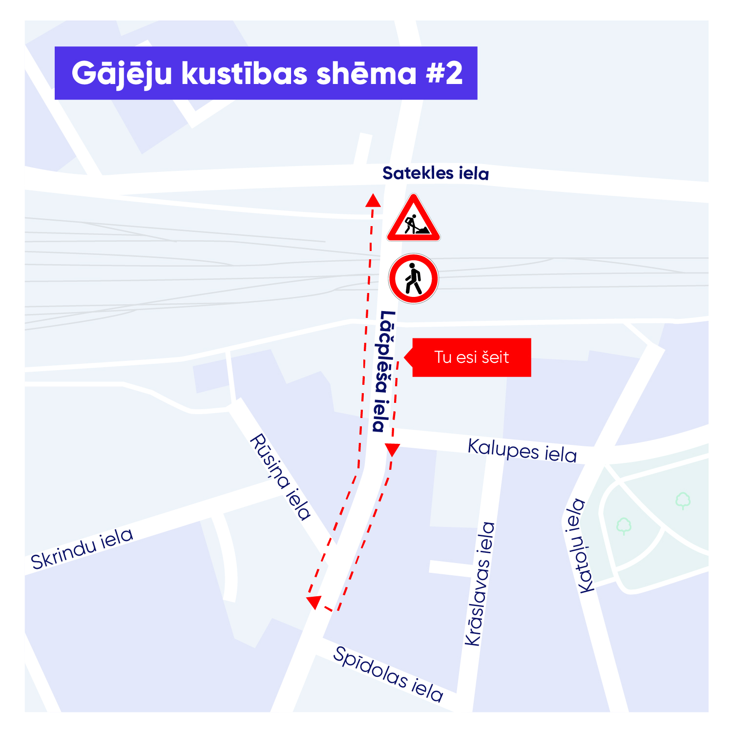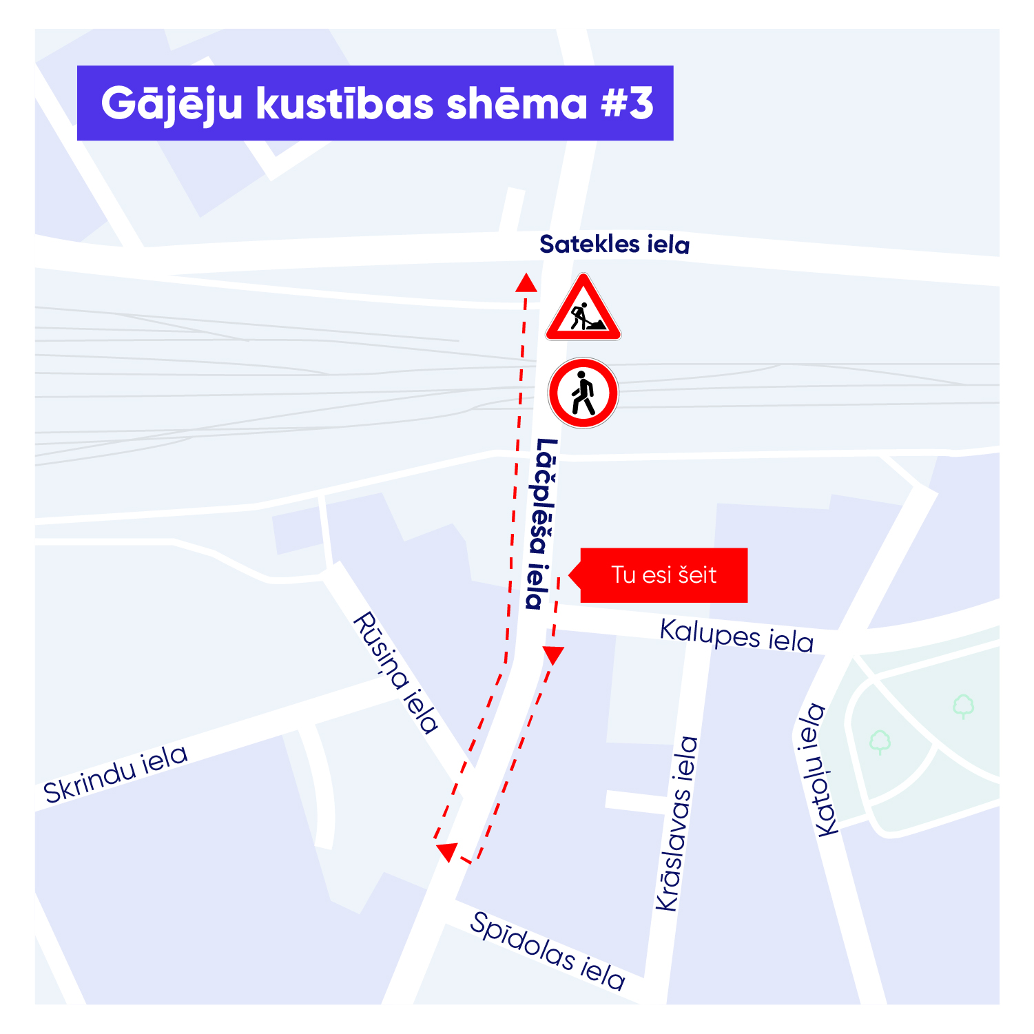 Būvdarbu laikā, līdz 24. septembrim, ierobežota transportlīdzekļu satiksme un gājēju kustība Lāčplēša ielas posmā no Satekles līdz Kalupes ielai, kā arī pie Lāčplēša un Satekles ielas krustojuma virzienā uz pilsētas centru un pie Lāčplēša un Kalupes ielas krustojuma.