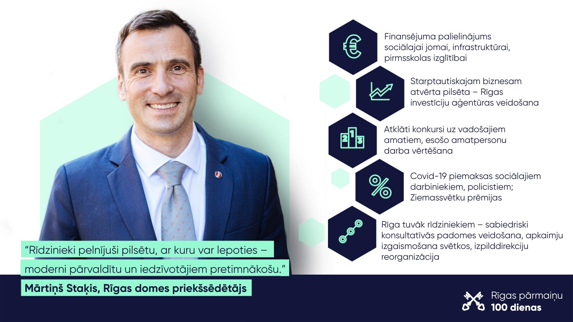 “Mēs kā komanda šīs 100 dienas esam strādājuši, lai panāktu godīgu un atvērtu pilsētas pārvaldību, veidotu modernu pilsētvidi un nostādītu pilsētu uz ilgtspējīgas attīstības trajektorijas. Mūsu mērķis ir Rīga, ar kuru varam lepoties, un pilsētas vadība, kas nevairās no atbildības un dara darbu,” sacīja Rīgas mērs.
