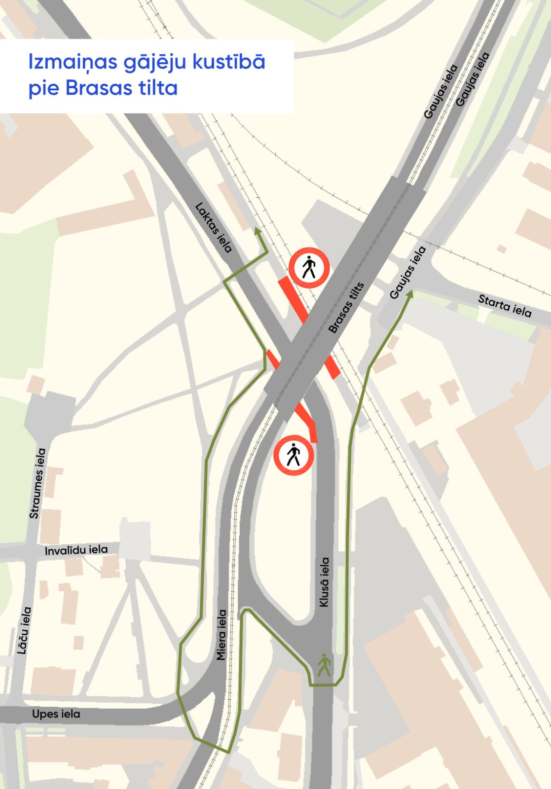 Saistībā ar Brasas tilta būvdarbiem no 15. jūlija mainīta esošā gājēju kustība. Turpmāk gājēju kustībai ir slēgts gājēju tunelis zem Brasas tilta pie Laktas ielas, izveidojot apejamo ceļu, lai droši šķērsotu būvdarbu zonu.