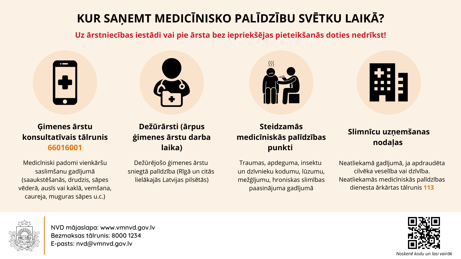- Neatliekamās medicīniskās palīdzības dienestā pa tālruni 113 – neatliekamos gadījumos, kad apdraudēta cilvēka veselība vai dzīvība!