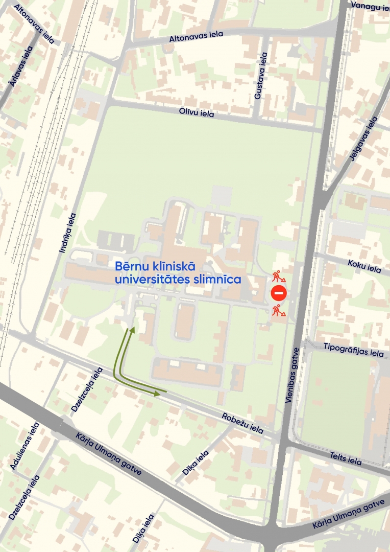 Saistībā ar Veloceļa “Centrs - Ziepniekkalns” izbūves darbiem piektdien, 1. jūlijā, no plkst. 07.00 līdz 17.00 tiks veikta Bērnu klīniskā universitātes slimnīcas galvenās iebrauktuves demontāža. Darbu laikā iebrauktuve transportlīdzekļiem būs pilnībā slēgta un teritorijā varēs iebraukt tikai pa Robežu ielas vārtiem. Gājēji un velo braucēji teritorijā varēs iekļūt arī pa Vienības gatves vārtiem.