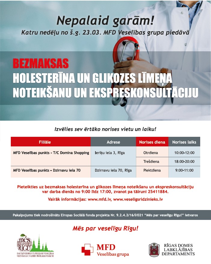 Bezmaksas holesterīna un glikozes līmeņa noteikšana un ekspreskonsultācijas tiks veiktas divās MFD Veselības grupas filiālēs Rīgā - Dzirnavu ielā 70 un T/C Domina Shopping (Ieriķu ielā 3).