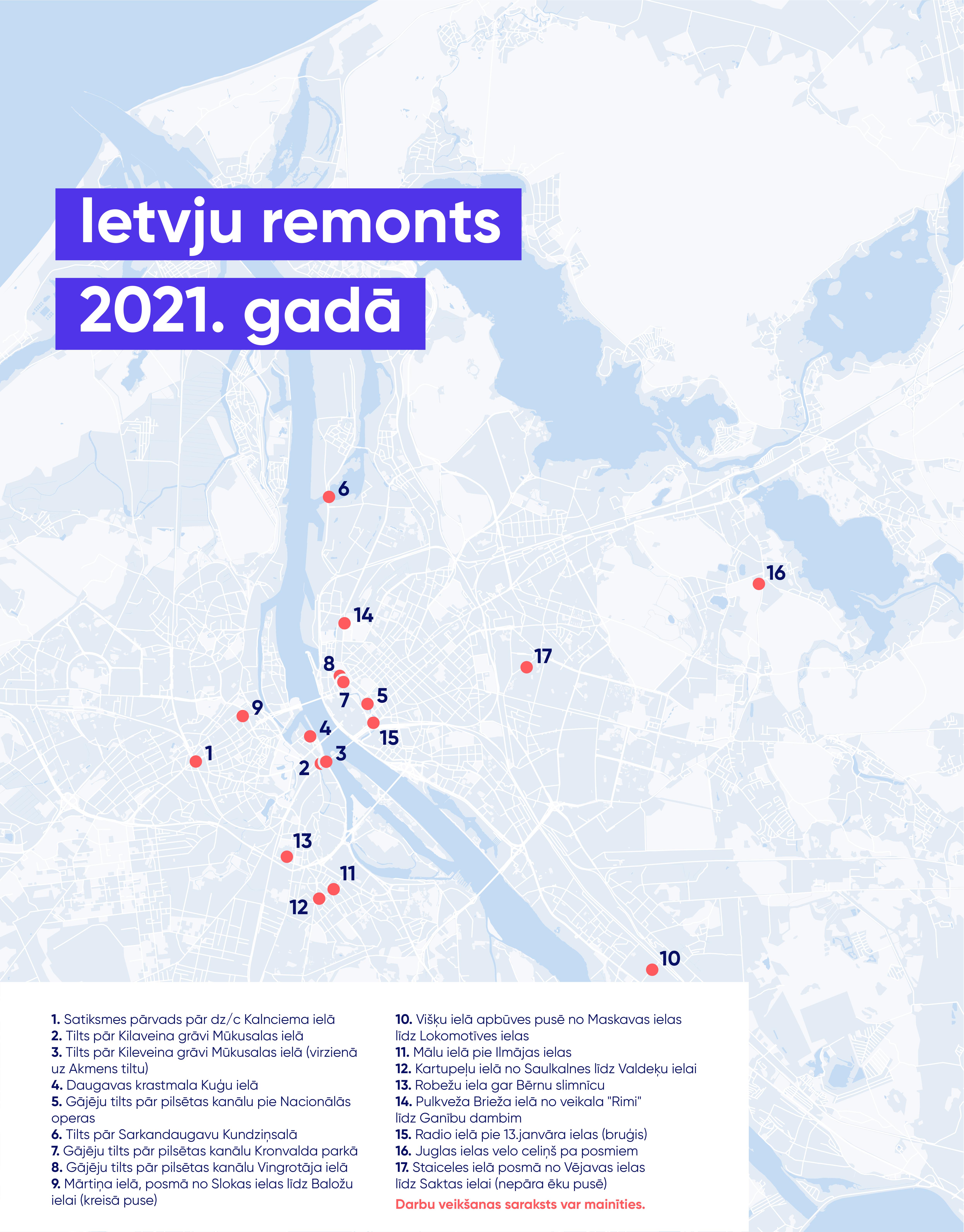 Par konkrēto ietvju remontdarbu veikšanas laikiem informācija tiks sniegta atsevišķi. Remontdarbu saraksts var nedaudz mainīties, ņemot vērā saskaņošanas procesu, kā arī citus neparedzētus apstākļus.