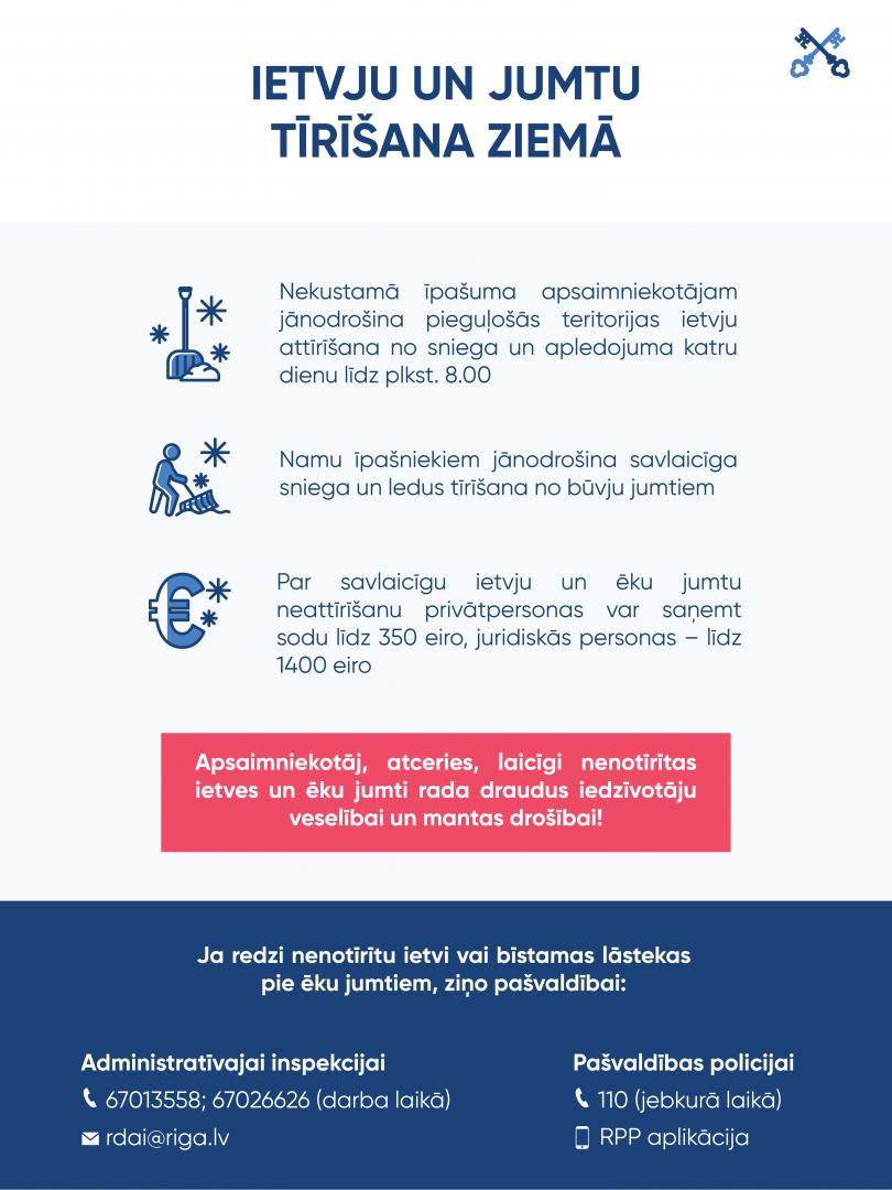 Par savlaicīgu ietvju un ēku jumtu neattīrīšanu no sniega un apledojuma Rīgas domes saistošie noteikumi paredz administratīvos sodus. Maksimālais sods fiziskām personām var sasniegt 350 eiro, bet juridiskām personām – 1400 eiro.