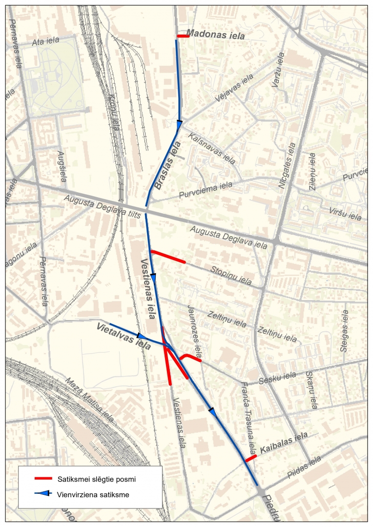 Turpmāk Braslas ielā, posmā no Madonas ielas līdz Augusta Deglava ielai, virzienā uz Piedrujas ielu transportlīdzekļu satiksme tiks organizēta vienā virzienā. Tāpat vienā virzienā notiks kustība Vestienas ielā, posmā no Augusta Deglava ielas līdz Vietalvas ielai, t.sk. pa pagaidu apbraucamo ceļu, virzienā uz Piedrujas ielu. Kā arī šāda satiksmes organizācija tiks ieviesta Piedrujas ielā, posmā no Vietalvas ielas līdz Pildas ielai, virzienā uz Lubānas ielu, un Vietalvas ielā, posmā no Matīsa ielas līdz Vestienas ielai, t.sk. pa pagaidu apbraucamo ceļu, virzienā uz Piedrujas ielu.