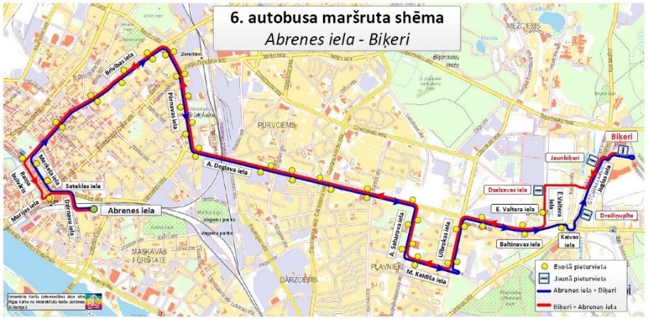 Впредь автобусы 6-го маршрута в направлении центра Риги будут курсировать по маршруту до улицы Аугуста Деглава, далее по улице Аугуста Деглава, улице Юглас до стоянки между торговыми центрами IKEA и SĀGA. В направлении центра Риги автобусы будут курсировать по улицам Юглас, Дзелзавас, Эвалда Валтерса и далее по существующему маршруту. На маршруте появятся новые остановки - «Дрейлиньупите» (улица Юглас), «Бикери» (автостоянка между IKEA и SĀGA), «Яунбикери» (улица Юглас) и «Улица Дзелзавас» (улица Эвалда Валтерса). Название маршрута изменено на «Улица Абренес - Бикери».