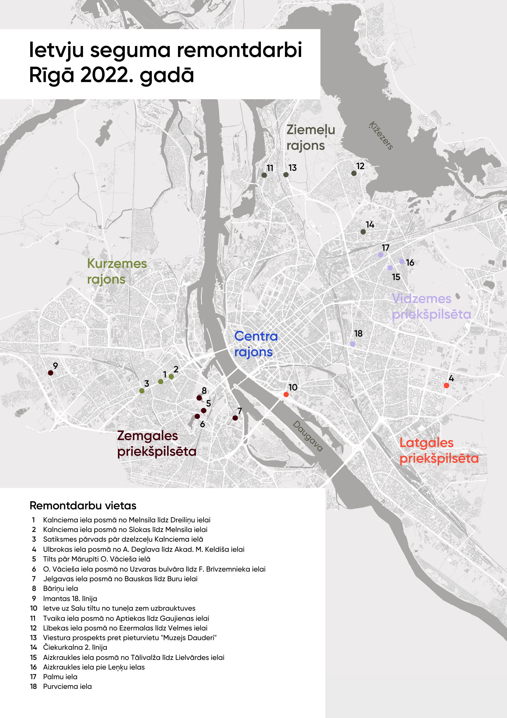 Самые объемные ремонтные работы запланированы на участке улицы Улброкас от ул. А. Деглава до ул. М. Келдыша, на улице Твайка, на участке от ул. Аптиекас до ул. Гауйиенас, а также на путепроводе через железную дорогу на улице Калнциема.